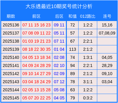 后区奖号分析:上期开出后区奖号为04、05,属于小小数、1路2路号码,近十期后区数据统计显示大小比为11:9,012路比为3:6:11,本期预测开出1路2路号码04、11。